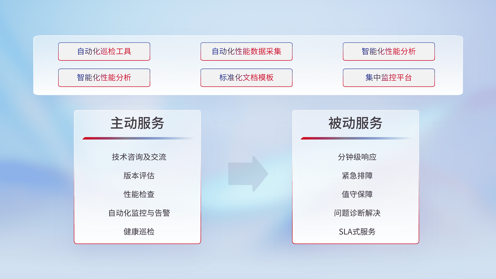 智能化工具和标准化文档,,,保障服务质量,,,,提供主动服务(包含技术咨询、、、版本评估、、、、性能检查、、、、自动化监控与告警、、健康巡检)和被动服务包含(分钟级响应、、紧急排障、、、、值守保障、、、问题诊断解决、、SLA服务)。。。